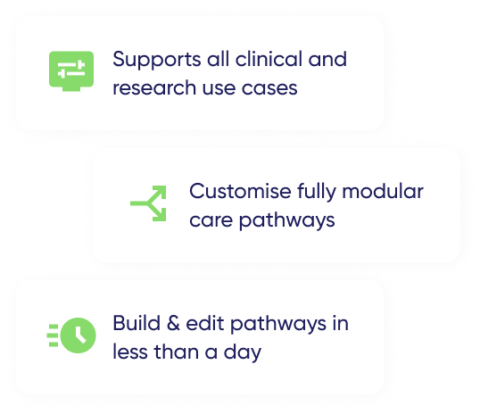 With our Configurable Care Workflow Builder, clinician and patient workflows are built using no-code drag and drop tools, enabling solutions across use cases (e.g. chronic monitoring, diagnostic hubs, virtual wards) and specialties (e.g. gastroenterology, oncology, ophthalmology). Work with our Clinical, Design and Product teams to quickly map and build to your needs, and leverage our library of reusable components and in-built capabilities to deliver a greater impact at a lower cost.
